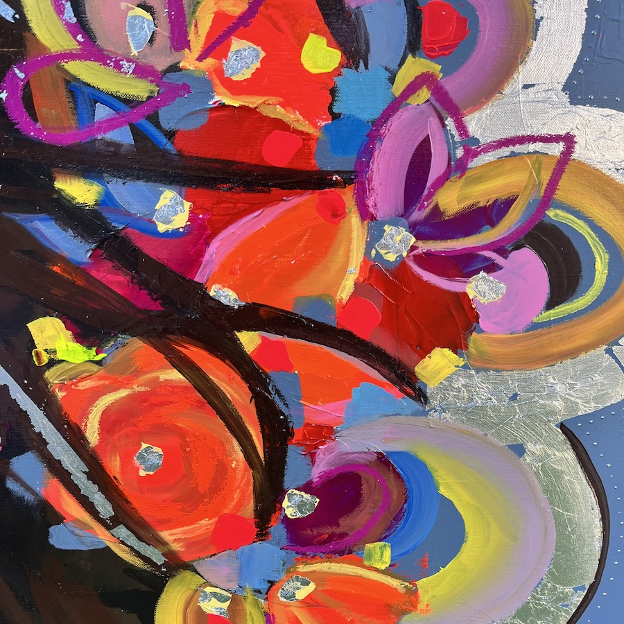 • Support & technique : Toile de lin sur châssis bois. Peinture acrylique au couteau, bâton à huile, pochoir & collage feuilles argentées.