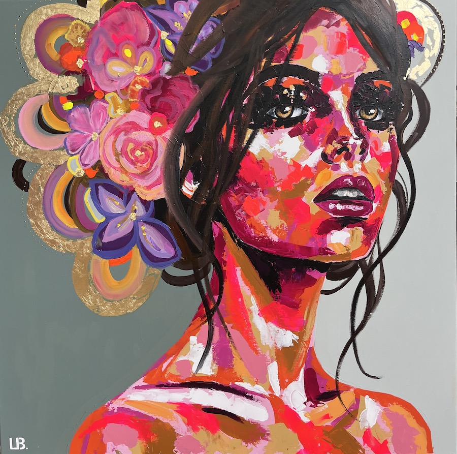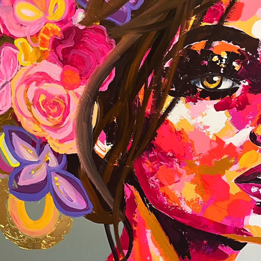 ✨ Pourquoi Grâce retient l’attention ? Grâce se révèle de trois-quarts, dans un équilibre subtil entre retenue et intensité. Son regard est profond, légèrement détourné, chargé d’une douceur habitée. La couleur est généreuse, lumineuse, posée en touches vivantes. Les contrastes — entre roses vibrants, orangés chaleureux, violets délicats et touches dorées — créent une harmonie fluide, presque organique.